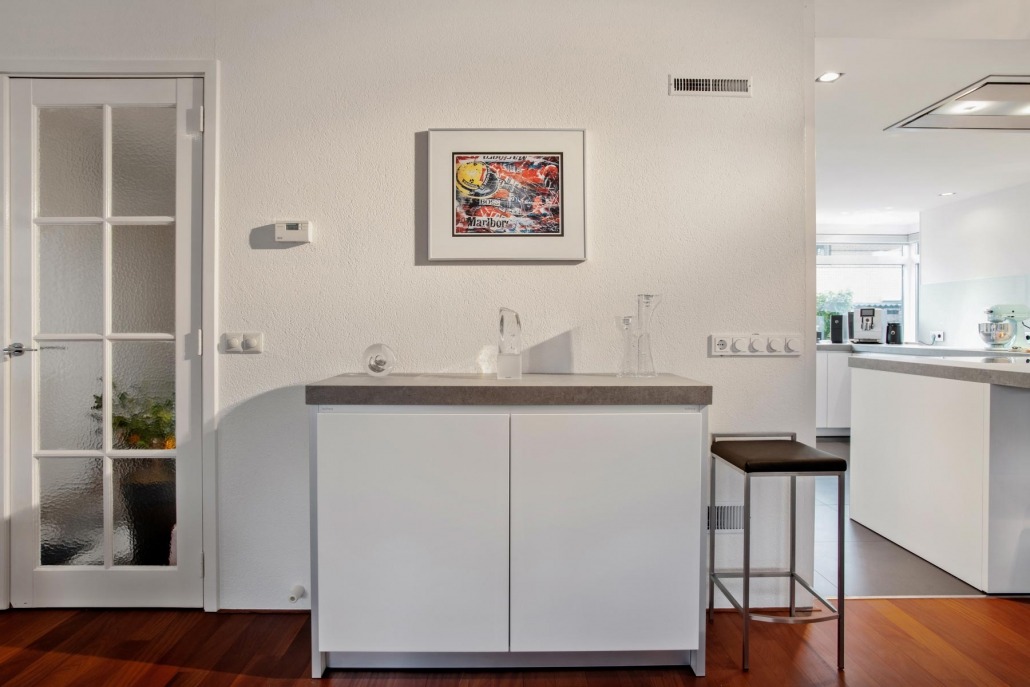 Ronald houdt veel van koken en bakken. Het kookplezier is alleen maar toegenomen door de nieuwe bulthaup met het ruime werkblad, twee bakovens, een combi-oven en combimagnetron. ‘Waar ik voorheen moest wachten totdat een gerecht klaar was, kan ik nu meerdere gerechten tegelijk bereiden. Geweldig!’ De keuken heeft ook veel opbergruimte, onder andere voor losse keukenapparaten. ‘Het fijne is dat je die niet eens uit de kasten hoeft te halen. Door elektriciteitsverbindingen aan de achterzijde kun je ze gewoon laten staan. Zo schuiven we bijvoorbeeld de ijsmachine even uit de kast en na gebruik schuiven we ‘m weer terug.’